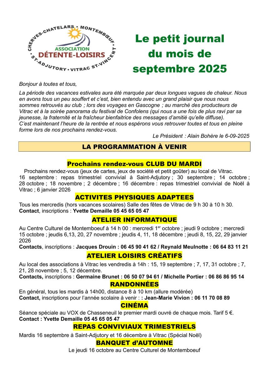 LES PAGES DE DÉTENTE-LOISIRS ![]() L'association Détente-Loisirs est ouverte aux personnes âgées de plus de cinquante-cinq ans des communes de Cherves-Châtelars, de Montemboeuf, de Vitrac Saint Vincent, de Saint-Adjutory, et des environs. Elle assure le fonctionnement d'un club intercommunal hebdomadaire, propose d'organiser et d'animer toute activité permettant à ses adhérents de se rencontrer, de partager des sorties et des moments de convivialité , de formation, d'information, de découverte et de participer à des événements culturels et sportifs.Elle propose de développer les solidarités et partenariats avec les acteurs institutionnels et associatifs du territoire. Un voyage en Gascogne a eu lieu le jeudi 3 juillet. Pour répondre à la demande, nous avons donc décidé d'organiser un second voyage qui aura lieu au printemps 2026. ![]()