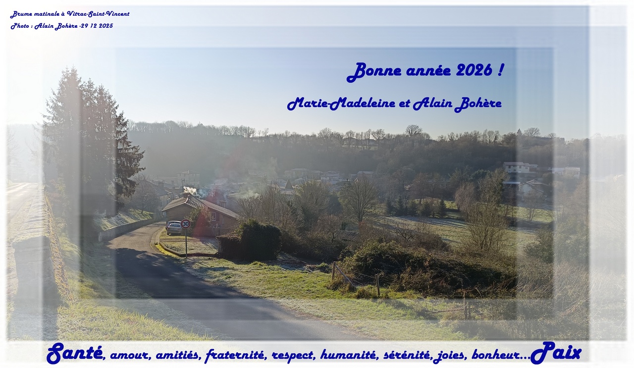 Ce site personnel est le résultat d'un collectage de documents et de rencontres au fil du temps qui passe. Vitrac-saint-Vincent, berceau familial où nous résidons depuis notre retraite, a une histoire riche, variée et attachante. C'est un joli village niché au fond d'une vallée verdoyante. Cet environnement, ses habitants, son école, sa vie associative, ses services en font un village bien éveillé où il fait bon vivre. Ce site se veut aussi le reflet de la vie et des événements qui jalonnent le quotidien de notre village mais aussi de ses voisins. Ce sont plus de cent dix pages que vous pouvez découvrir contenant plus de deux mille documents divers. Grands mercis à toutes celles et tous ceux qui nous font le plaisir de visiter ce site. Vitrac, février 2026 Alain Bohère (bohere.alain@orange.fr)