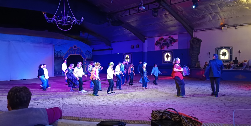 Chaque fin d’année, l’association Détente-Loisirs propose une sortie festive « cabaret » à ses adhérents. Cinquante-trois d’entre eux sont allés au cabaret Zagal à La Palmyre pour assister au spectacle équestre « Les Portes du temps ». Une chanteuse, un chanteur et une accordéoniste ont brillamment agrémenté le temps du repas pendant qu’un magicien « close-up » passait de tables en tables pour proposer des tours de passe-passe bluffants. Le spectacle qui a suivi, a enchanté tout le monde. Poésie, prouesses des cascadeurs et des voltigeuses, acrobaties aériennes, humour ont été les ingrédients d’un après-midi particulièrement réussi dont les chevaux constituaient les vedettes principales. Du pur bonheur !